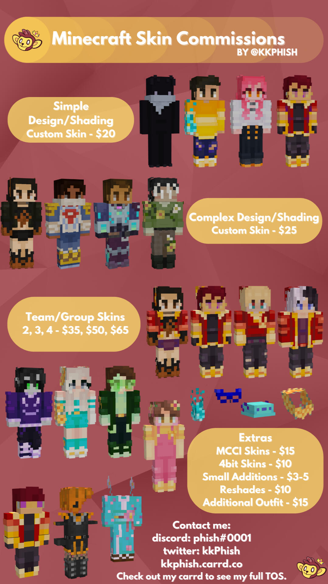 - Payment is done through PayPal, ko-fi, or Venmo (PayPal/ko-fi preferred)I also have Elytra and Migrator Cape + Elytra skins available for commission, please reach out for more details :]